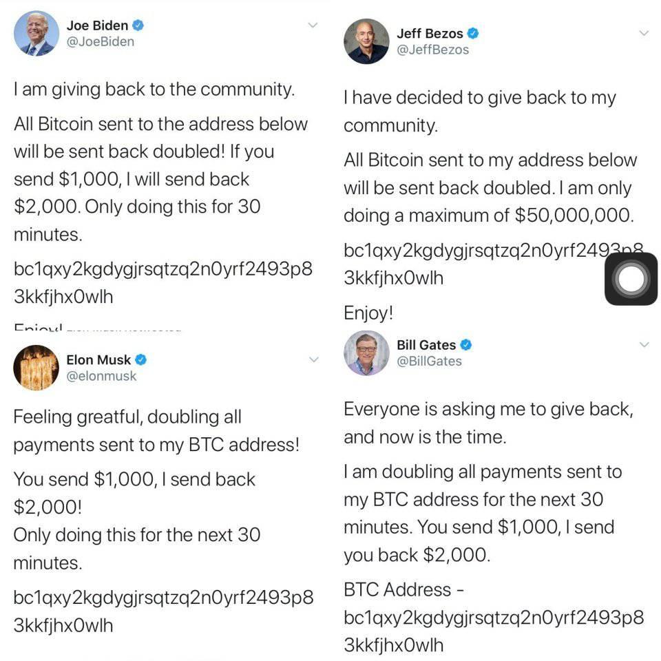 Twitter accounts of prominent individuals were compromised by bitcoin hackers